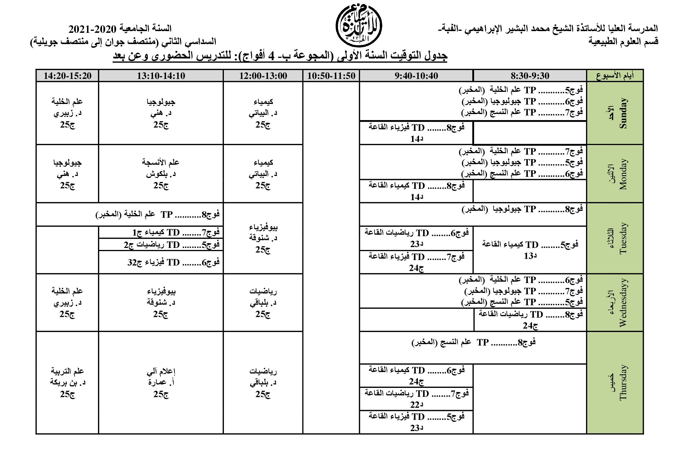 جدول توزيع الدروس حضوريا السنة الأولى علوم طبيعية المجموعة ب