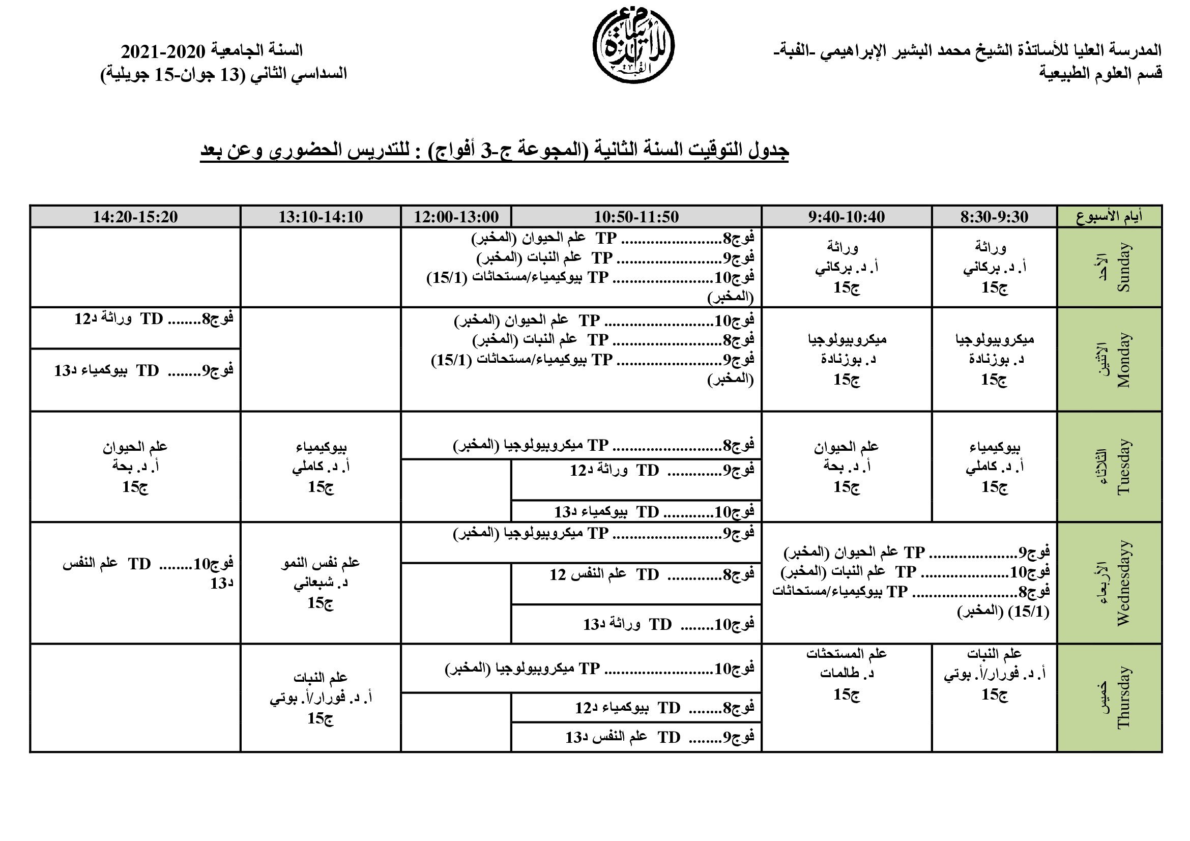 جدول توزيع الدروس حضوريا السنة الثانية علوم طبيعية المجموعة ج