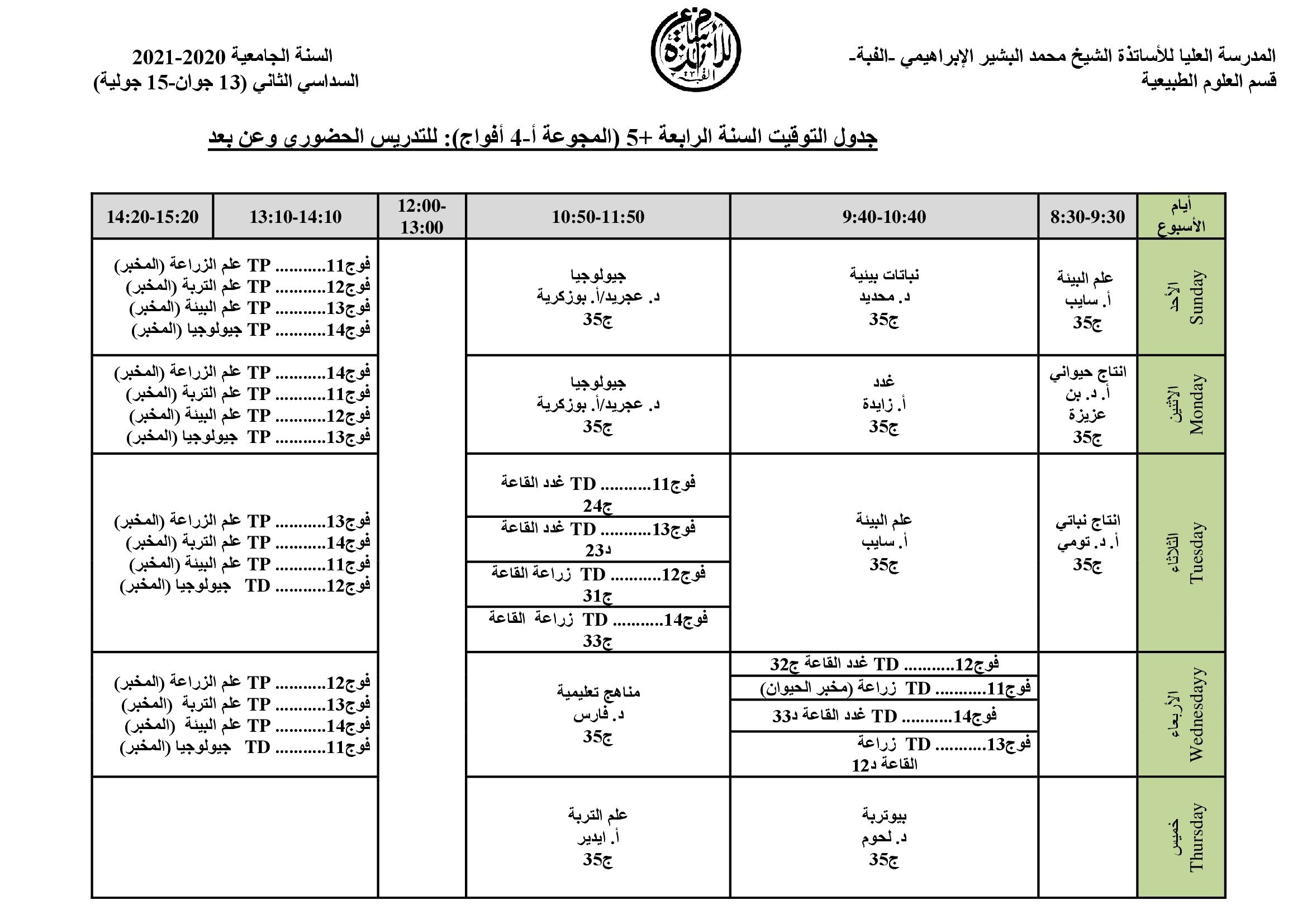 جدول توزيع الدروس حضوريا السنة الرابعة علوم طبيعية المجموعة أ